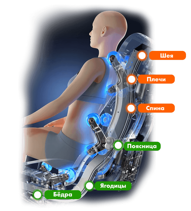 Массажный механизм 2х3D копирует движение рук массажиста, обеспечивая более глубокий, реалистичный и эффективный массаж.