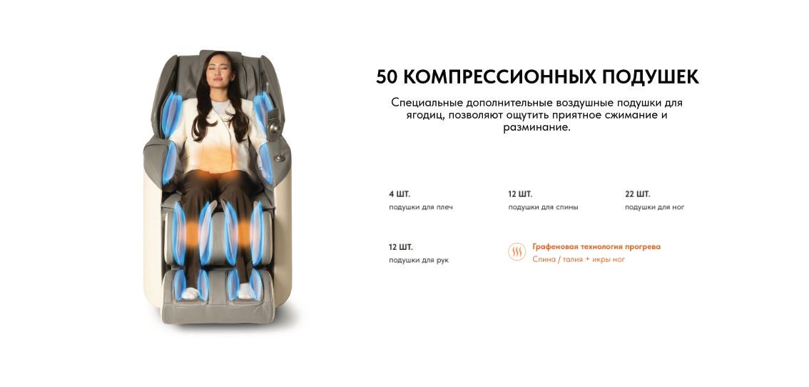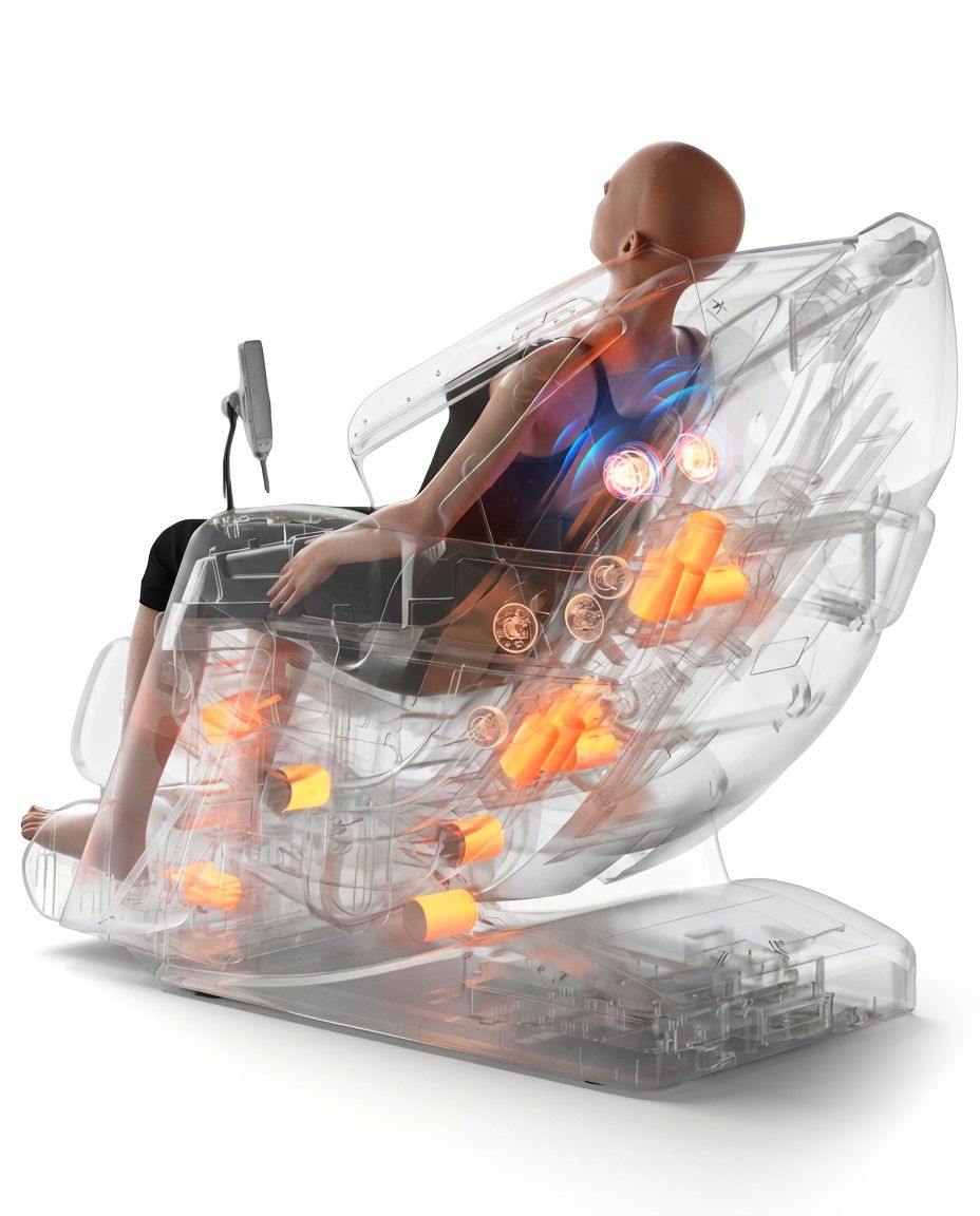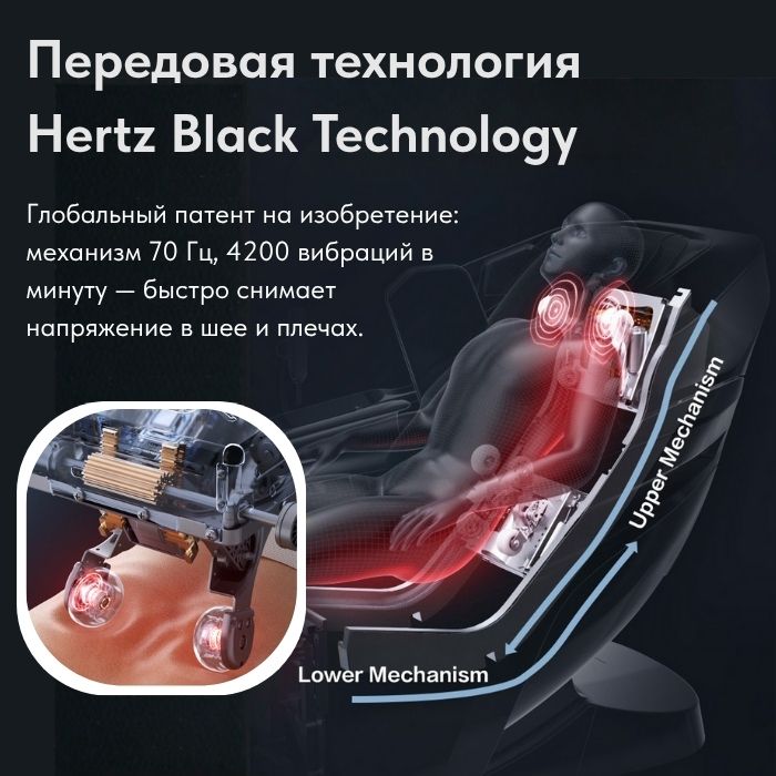 Кресло оснащено шестью независимыми массажными модулями, работающими от двенадцати мощных двигателей. Такая система обеспечивает точное и равномерное воздействие на всё тело, позволяя глубоко прорабатывать мышцы, быстро снимать напряжение и создавать ощущение профессионального массажа без лишнего шума.