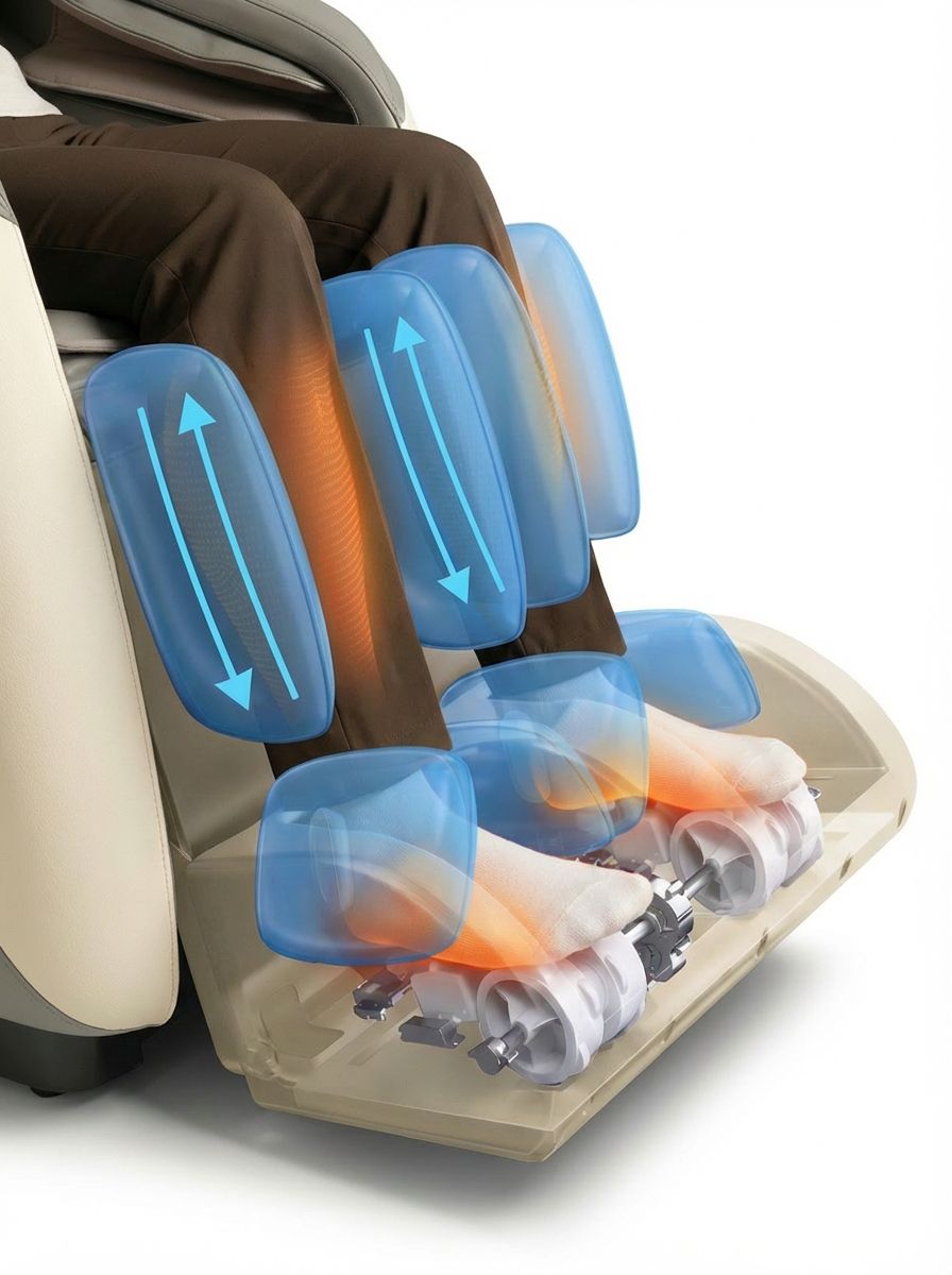 Компрессия и растирание икр последовательно сжимают икры и стопы, усиливая кровообращение и снимая усталость после долгого дня. Встроенные ролики для стоп глубоко прорабатывают активные точки, помогая расслабить мышцы, уменьшить напряжение и вернуть ощущение лёгкости в ногах.