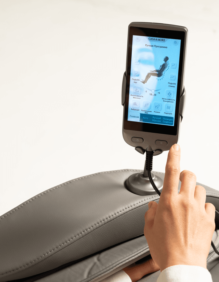 Интуитивный сенсорный LCD-пульт позволяет легко управлять всеми функциями кресла: выбирать программы массажа, регулировать интенсивность и переключаться между режимами в несколько касаний. Дополнительные быстрые кнопки на подлокотнике обеспечивают мгновенный доступ к основным настройкам, делая управление простым и удобным во время сеанса.