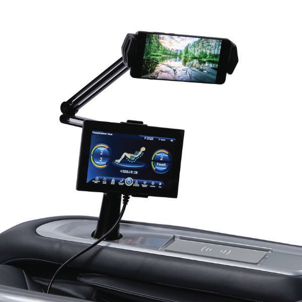 В комплекте удобная подставка под телефон или планшет, которым можно управлять специальным джойстиком, встроенным в подлокотник, не отвлекаясь от массажа